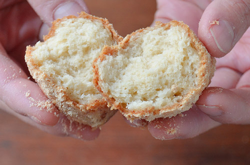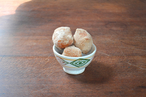 | 2.台の上に多めに粉をふって生地をのせ、 1cmの厚さに手でぽんぽんとたたいて伸ばします。 カードで一口大に切ります。 菜箸を水で濡らしてよく拭いて油の中にそっと入れ、 細かい小さな泡がしゅわしゅわ出てきたら、 170度、適温です。 一口大に切った生地を、 余分な粉をはたいて油の中にそっと入れます。 たくさん入れると温度が下がってしまうので、少なめに。 ミルクパンなら2〜3個ずつ。 箸でくるくると返しながら両面が おいしそうなキツネ色になるまで約3分ほど揚げます。 最初は重みのあった生地が、 箸でもった時ふわっと軽くなれば揚がっています。 よく油を切ってから、 熱いうちにきなこと砂糖を混ぜてまぶしつけます。 |
