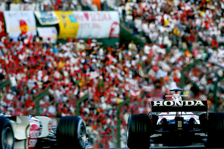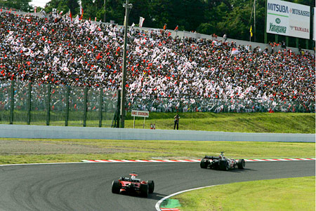 2005年の日本GP、第2コーナーの琢磨選手応援席で日の丸が揺れる。