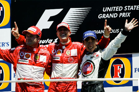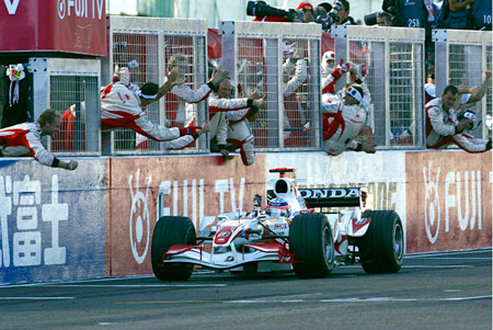 2006年、日本GPでチェッカーを受ける琢磨選手と、喜びのチームメイト。