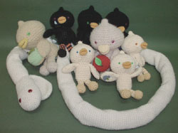 No.287 タイトル:とり天使ととり悪魔 作者名:Tori-X 大きなりんご付天使が「とり大天使」で、 黄色い小さな天使が「とり天使」、 小さな黒い天使が「とり悪魔」です。 へびは天使と悪魔の仲介です。