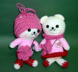 No.071 タイトル:だいすきだから・・・。 作者名:竹沢愛美 恋人同士のくまです。 帽子などは全部取り外しが出来ます。 「恋」をテーマにして作りたかったので、 全体的にピンク系にしてみました。 あと、「こんなカップルになりたい」 という思いを込めて・・・。