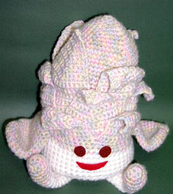 No.098 タイトル:たけの?ちゃん 作者名:竹垣麻里子 この作品で苦労した点は、 たけのこの皮の大きさ、手を皮でするか、 動物の手のようにするか、何度も編み直しました。 パッと見たらハクサイに見えがちですが、 たけのこだと思って見てください。