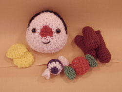 No.317*最終選考 タイトル:黒糖かりんとうあめ玉 おにぎりくん+たくわん2枚 作者名:ちe かりんとうのいびつさを出すために 増やし目や減らし目を適当にやりました。 おにぎり君の鼻の梅干し、髪ののりを工夫しました。 おにぎりの三角形に編むのは初めてだったので、 苦労しました。