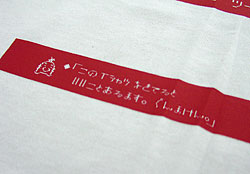 今回の「ほぼ日ベストスタンダードシャツ」のなかでも、 ダントツに人気の高かった「どせいさんコラボT」。 その胸と背中側の裾に入る、プリントの完成品が、 ようやく到着しました! 胸のグラフィックが横幅で約23cm、 背中側の裾に入るグラフィックが、 同じく横幅で約20cmの大きさです。 背中側のどせいさんフォントで書かれた、 「このTシャツをきてると いいことあるます。ぐんまけん」 というメッセージや、その右側にあるクレジット部分など、 かなり細かいプリントになるので、 文字がつぶれたりしないように、 何度もテストを繰り返していたのですが、 そのへんもクリアできて、これで確定! です。 ![]() ![]() 「うーん。これ見てると、 欲しくなるよなぁ〜」 プリントを眺めながら、自分でちゃんと注文したくせに、 なぜかdarling、そうつぶやいておりました。 でも、確かにデザイン画で見てるときより、 数段、魅力がアップしてるんですよ!! なんだろう?具体的なモノのチカラ、なのかなぁ。 次は、このグラフィックが「B.S.T.」のボディに プリントされて届くかと思うと、 ちょっとたまらないものがあります。 早く見たいなぁ! そのサンプルが届いたら、またすぐに報告しますから、 楽しみにしていてくださいね!
