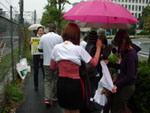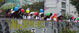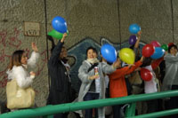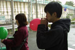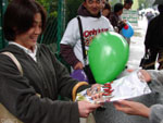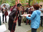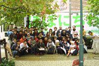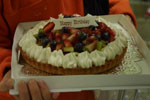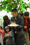 なにやら、店長とうーが密談中。 タイミングを計っている模様。 バスも到着! 通天閣がケーキをもってバスから降りてくる。 で、↓HAPPY BIRTHDAY TO Darling!! うわ〜い。記念撮影だ〜〜。 「お〜い、子供や、女子〜。甘党の男子〜。 食べたい人はケーキたべろ〜。」 こどもたち。 女子たち。 甘党の男子。