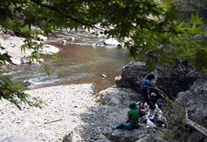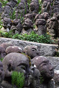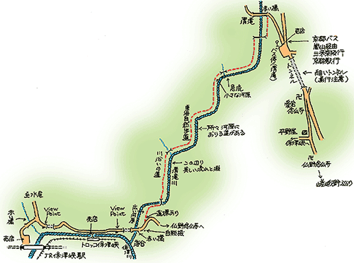 いや、お弁当重いし、 悪くなったらあかんからね。 雰囲気的にも、初っぱなの 河原のあたりで召し上がるのがいいですよ。 河原でお弁当をいただくのは、最高です。 ふつうのおにぎりだって、山下清さん風に 「おいしいんだなぁ」と思えます。 清滝方面に向かって、 川の流れにそって歩きます。 せせらぎのそばは、ほんとうに気持ちいい。 清滝に到着。 与謝野晶子さんの碑文が。 おたぎ念仏寺。ここには、 五百羅漢さんがおいでです。 いまや1200体もいらっしゃるそうな。 羅漢さんのお顔は、それぞれに違います。 おもしろいですよ。 このあたりは「京都バス」が運行しています。 「銀閣」へは、京都駅行きに乗り、 烏丸七条で降りればオッケー。 歩き疲れたら、平野屋さんで 甘いものとおいしいお茶をいただきましょう。 清涼寺。ここには釈迦如来立像など 国宝がたくさんあります。 お庭もたいへんよろしいです。
