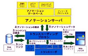 「あったらいいなー、欲しいなー」と 切実に思ってるソフトのひとつです。 トランスコーディングというのは PC、携帯電話、PDAなどなどの 使うマシン環境の違いや 異なる言語環境での利用など、 いろいろとインターネット利用が 多様を極めてきている中…、 発信者が「入力」を一回すれば、 いろいろな状況に応じて、自動的に、 コンテンツが変換されていくという技術なんです。 その中でも長尾さんの研究は、 セマンティック・トランスコーディング と言います。なにやらかっこよいけど 難しそうな名前ですね。 直訳すると「意味的に行うコード変換」。 で、それは何か? 『インターネット上のさまざまなコンテンツを もっともっと賢く便利に活用するためのツール』 つまりインターネットで 情報を発信する人にも受信する人にも 「賢いゲタ」を履かせてくれるツール。 なーんて大胆に言ってしまっていいかしら>長尾さん。 実は、トランスコーディングを紹介する 長尾さんの本格的インタビューサイトが ガツンとコチラにあるんです。 4番目のストーリーです。 (長尾さんのこともクローズアップ!) これは、私のインタビューを読むよりも ちゃんとしていていいかもしれない(笑)。 これを見ると「あーだ、こーだ」と トランスコーディングのことを説明しなくても 大丈夫かなと思ってるのですが、 ちょっと時間を割いて読んでみてください。 私のインタビューは、言ってみれば、 裏サイトという雰囲気で…。 長尾さんの本音もちらりと出てくるし、 きっと楽しめると思うんだけど。 ●アノテーション ひとつだけ、アノテーションという 言葉が話の中に出てくるので、その説明をします。 これは、大事な言葉です。 アノテーションとは、要するに Web上のコンテンツ(テキスト、画像、映像、音声など)に、 ひとつひとつ加えていく「裏説明」みたいなものだと 考えてください。 例えば、テキストなら、 文節や文法などの分析が裏(別のサーバ上)で、 施されているとか。 画像なら「いつ、どこで、誰が、どういう状況で撮ったもの」 あるいは「赤いセーターを着た女性が手を上げているシーン」 のような情報が、画面には見えないところで 付加されているというものです。 もうちょっと専門的なところに足を踏み入れちゃうと、 アノテーションは、大きく分けて
