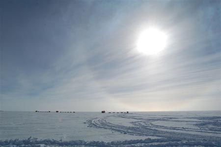 2006年2月11日、 南極大陸の上にあるドームふじ基地から 昭和基地まで1000kmの道のりを 二週間かけて移動しました。 ![]() 「ドーム基地から昭和基地へ」 雪面に点々と見えるのは雪上車とソリ。 雪の下は3000m近い厚さの氷です。 太陽のまわりにはハローが現れています。 ※ハロー:太陽の光が氷晶からなる雲(巻雲、巻積雲)を 通るときに 氷晶による反射や屈折のために散乱されることで生じる。 「雪氷辞典より抜粋」 ご挨拶があとさきになりました。 はじめまして。第47次日本南極地域観測隊、 斎藤健(さいとうたけし)です。 観測隊の中では気水圏(きすいけん)という、 極域の大気、雪氷、海洋を研究している グループに所属しています。 昨年10月30日に日本を出てから 昭和基地と南極点の ほぼ中間にあるドーム基地というところで ほぼ三ヶ月、14人の男所帯で生活していました。 今回は空路で南極入りし、 ビルの立ち並ぶ街から一気に真っ白な世界に置かれ、 少々戸惑いましたが、 12年ぶりの南極を実感しているところです。 特にここ昭和基地は新しくなった建物もありますが、 かつて歩いた道は変わらず、景色も同じ。 帰ってきたなあ、としばし感慨にひたりました。 ![]() 「昭和基地」 場所は19広場(イチキュウヒロバ)といい、 外で何か催し物があるときは19広場集合になります。 名の由来は19次隊が設定という単純な理由です。 薄い緑は廃棄物集積場、黄色は通路。 古い建物は1957年に第一次隊が建てた旧娯楽棟です。 さてドームふじ基地で暮らした三ヶ月の間、 通信に制限があって思うように連絡がとれず、 南極からメッセージを送ることを控えておりましたが、 そうした状況でも、皆さんからいただいたメールは できる限り転送していただきました。 メッセージを拝読していると、 知らず知らずに涙が頬を滴り、 自分の周りにはたくさんの応援があること、 南極へ思いのある方々が たくさんいらっしゃることをひしひしと感じ、 それが日々の生活と観測の大きな励みになりました。 まるで皆さんが身近にいるようでした。 そして、ただただとてつもなく広がる白い大地に住み、 何もないけれど、 皆さんに見てもらいたいと思いながら暮らしていました。 でも残念ながら、 叶えられることはちょっと難しいようですので、 この「南極ほぼ日手帳ものがたり。」を通して 疑問や励ましの回答、 そして私が感じたことを少しずつ 自分の言葉でお伝えしていきたいと思います。 あらためて、日本国内のみならず 海外からもメッセージをいただき、 皆さんには心から感謝し、 ぼちぼち始めていこうと思います。 2006年2月27日 昭和基地、晴れ、気温‐5℃前後。 珍しくほとんど無風。 第47次日本南極地域観測隊 斎藤 健