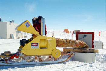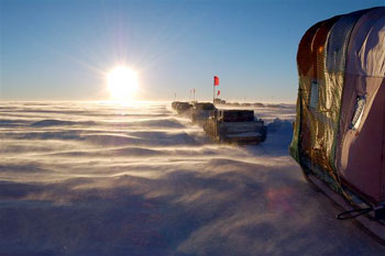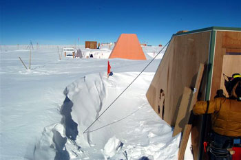 標高3820m。 昭和基地から1000kmほど南極点に向ったところに 日本観測隊4番目の基地、ドームふじ基地があります。 一年の平均気温は−54.4℃、 最低気温は−79.7℃を記録したところです。 (提供:国立極地研究所) そんなに寒くて、遠く離れたところに 科学者、技術者が集まって 一体何をしているのかというと‥‥。 雪と氷の大陸といわれる南極。 ここに降る雪はほとんど融けることなく積もり続け、 やがて自らの重みで氷に姿を変えます。 氷の塊は氷床(ひょうしょう)と呼ばれ、 古いものは数十万年もの間、大陸の上に残っています。 氷床の厚さは平均2400m、 厚いところでは富士山を越えて4200m。 南極をスパッと縦に割って横からみると 一番底に大陸があり、 その上に氷の塊が載っている姿は まるで中華まんのようです。 そして氷の内部には 雪が氷へ変化したころの空気や 微小粒子も一緒に閉じ込められ、 この空気の入った古い氷を採りだすことが ドームふじ基地の目的です。 ![]() キャンプ地に着いて橇(かんじき)です。 真夜中ですが、太陽は沈まず。 ![]() ドームふじ基地近景。 オレンジ色のテントが氷をサンプリングするところです。 この下3000mまでドリルが降りていきます。 南極が夏に向おうとする昨年10月末、 昭和基地を離れ、ドーム基地に向いました。 大きな雪上車で橇に載せた燃料や食糧を引っぱり、 車の中で寝泊りしながら約一ヶ月の後、 無人のドームふじ基地に到着。 ![]() ドームふじ基地へ向う旅行の様子です。 1台の雪上車が荷物満載の橇を7台引いていきます。 着いてからまずは生活できるように基地を立ち上げます。 夏とは言っても基地の中は−50℃。 据付けてあるエンジンも冷えきっていて、 これを温めることから始まります。 はじめは小さなジェットヒーター、そしてエンジン、 そして建物全体を大きなジェットヒーターで暖め、 基地を立ち上げます。 ![]() エンジンを温めるジェットヒーターを暖めます。 ![]() −50℃のエンジン。 ![]() エンジンはジェットヒーターで暖めます。 ![]() こちらは建物の中を暖める大きなジェットヒーター。 ![]() 建物の中は布製のパイプを這わせます。 南極大陸の奥地、 雪の下に眠る基地に少しずつ息吹を戻し、 そして特殊なドリルを使い深さ3000m、 太古の氷のサンプリングへ進みます。 この氷は過去の地球環境を報せてくれる タイムカプセルです。 2007年2月6日の昭和基地、 気温+0.7℃ 風速1.8メートル毎秒。 日差しが強く暑いくらいです。 明日、昭和基地からしらせに乗艦します。 第47次日本南極地域観測隊 斎藤 健 ************************* 「後編」では深さ3000メートルの氷の中から どのように太古の氷をサンプリングしていくのか 教えてもらえますので 明日もぜひこのページをのぞいてみてくださいね。 いよいよ「しらせ」に乗艦して、 帰路についた斎藤さんですが、 南極の様子については みなさまから今までにいただいている質問に答える形で もう少し教えてくれるそうです。 「まだ質問を送っていなかった!」 「聞きたいことがある!」という方は ぜひ「南極観測隊斎藤さんへ」として postman@1101.comまで送ってくださいね。 南極観測について、 さらに知りたいという方は こちらの「極地研究所」のホームページも ぜひご覧ください。 |