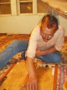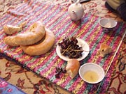 | レポート#8 サマルカンドのナンはサマルカンドでしか作れない 10/29 つづき 彼のの名はウルマス・アルモソフ。 アフラシャブの丘の上であった羊飼いだ。 ウルマスと歩いていると、行き交う人から 「サラマリコン」と次々に声がかかる。 相手が若者だと、彼は「うん」とばかりにうなずくだけだ。 年上のヒゲ老人なんかだと こちらから「サラマリコン」と挨拶する。 曲がりくねった道の白壁、時々茶壁には、 ぽつり、ぽつりと扉があり、 そのうちの一つの前でウルマスが立ち止まった。 扉をたたいて、声をかける。 するとなかから女性の声が答えて、 観音開きの扉が中に開かれた。 ウルマスと羊に続いて扉をくぐる。 その先は中庭になっている。 そこを囲むように左右に家屋が、 正面に作業場みたいな小屋が建っている。 羊は、扉からすぐ左手、 家屋との角に作られた小屋に入れられた。 ![]() ウルマスの奥さん 僕は居間に通される。 右手の建物、上がってすぐの部屋だ。 入り口で靴を脱ぎ、座布団の上にあぐらをかく。 居間にはおばあちゃんが一人座っていて、 やがて先ほど扉を開けてくれた奥さんが挨拶にやってきた。 いきなり珍客を夫が連れてきたというのに、 落ち着いている。にこやかである。 それから小さな子供達が覗きに来る。 すぐに若い娘さんがお茶を運んできた。 大家族である。 ウルマスは僕の隣にどっかりと腰をおろし、 お茶と、庭で取れたぶどうなどを勧めてくれる。 わずか数頭の羊で生計が成り立つはずも無いので、 「仕事は何をしてるんだい」と聞く。 すると、 「ナンだ。リピョーシカ(ロシア語)だ。」といいながら 両手で円盤を作るようなしぐさをする。 そして作ったナンはバザールへ持っていって売るという。 つまりは、ホームメイドのパンを 市場で売っていると言う訳だ。 ![]() ナンとぶどう それを聞いてうれしくなった。 なぜならナンはサマルカンドの名物だからだ。 こんな逸話がある。 「あるときブハラのハーンがサマルカンドのナンを いたく気に入り、腕利きの職人をブハラに連れて来て 作らせようとした。 ところが出来上がったナンは 普通のブハラのナンにすぎなかった。 そこでハーンは、粉を取り寄せた。 それでもやっぱり同じだった。 次には水と塩も取り寄せた。 それでもやっぱり駄目だったので、ハーンは頭に来て 『次はサマルカンドの空気を運んで来い』と 叫んだそうな。 結局、サマルカンドのナンは サマルカンドでしか作れない、と 最後はハーンもあきらめたとさ。」 いまでもタシケントやブハラの人間がサマルカンドに来ると お土産にナンを買っていく。 夕食に出されたのはジャガイモや豆、羊肉の入ったスープと もちろん、ナン。 円盤状のナンを手にとるとどっしりとした重さがある。 力を入れてちぎり、口に運ぶ。 うん。これがナンというものだ。 どっしり、しっとり、もちもち。 タシケントで出されたナンはどれも ぺにゃぺにゃ、へにょへにょ、 資本主義的軟弱安逸食物であった。 僕は内心、「この国の食文化はどうなっちまったんだ。」と がっかりしていたのだが、 それは早とちりだったらしい。 僕の記憶のナンがサマルカンドのものだったのだ。 夕食後にウルマスと、ナルディーというゲームをした。 さいころで駒を進めるボードゲームだ。 僕の好きなバックギャモンとボード自体は同じものだが、 ルールがまったく違う。 それでも以前は、チャイハナで子供相手に対戦し、 初めてだというのに2連勝したことがある。 こんども結構いい勝負ができるのにちがいない。 と思ったら大間違いで、想像よりも奥の深いゲームだ。 ウルマスは上手で、僕が一手指すごとに 「そこは良くない、こっちだ。」と直される。 ![]() ゲーム中 ゲームには、個性が出る。 ウルマスの性格も垣間見れた。 頭の回転が速く、物事がきちんと片付いていないと 気がすまない。 反面、ちょっとガンコ。 実直で正義感の強く家族思いのこのオヤジの家で、 僕のサマルカンド生活が始まった。 |