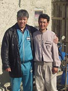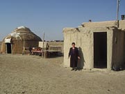 | レポート#17 「アイムアグッドマン」 11/6 イボットは以前と同じロシア製のジグリで迎えに来た。 めだった違いはフロントガラスのヒビワレぐらいだ。 これは別に珍しいことではなく、 こらではタクシーに乗っても 3台に2台は盛大にひび割れがある。 ワレのパターンは豊富で、 基本は稲妻型だがイチョウ型、枝垂れ柳型などがあり、 それぞれに水平、垂直、斜めのパターンがある。 怖いのは全面崩落寸前型と心霊現象的人面型だ。 これを研究して、 その日乗ったタクシーのひび割れで運勢を判断する、 世界初の「ヒビワレ占い師」になろうかと 思ったことすらある。 イボット車は、稲妻型逆傾斜左三分の一ヒネリ。 今日の運勢は晴れのち曇り時々ウオッカと見た。 向かうのは以前に結婚式の写真を撮った カザフ族のザミール君の家だ。 「スタンドによってガソリン入れてくよ。 方向が違うけどブハラでまともなガソリン売ってるのは そこしかないんだ。」 「1リットルいくらなの?」 「250ソムだ、僕らにはとても高い。 大学の給料が7000ソムだぜ。」 「あそこで道路工事している人達いるだろ? 彼らの給料もそれぐらいなのかい。」 「彼らはもっともらうよ、きつい仕事だからな。 悪いのは医者と学校の先生さ、 僕も通訳の仕事してたときは良かったよ。 スペイン、イタリア、アメリカそのときは100ドル。 日本人とも一緒に働いたよ。」 「JACだっけ?」 「そう、空港の滑走路を作るプロジェクトの通訳だ。 あの時が一番良かった。 月に300ドルもらってたからね。」 「それで一昨日あったときに 僕をそのときの誰かと見間違えたんだ。」 「日本人は面白い、どの国の人とも違ってる。 あんなに一生懸命に働く人達は他にいないよ。 普通は2年かかるっていうのを 9ヶ月で終わらせたんだぜ。 毎日夜遅くまで働いて、雨が降ってもおかまいなしさ。 その後、空港ビルの建設をイタリアの会社が請け負って 彼らとも働いたんだけど、まるでやり方が違ってた。 イタリア人は楽しいよ、ジョークばっかり言っててさ。 人生を楽しむって事にかけて彼らは天才だね。 でも、見ただろ?まだ工事中さ。 途中まで作ったトコで設計ミスが判ったんで 解体してまた作り直してる。」 ガソリンを半分ほど入れて車は郊外をめざした。 ![]() カザフ族の居留地区を走る。 一時間ほど走って検問のポイントを過ぎると、 舗装された道路からはずれて左に折れた。 だだっ広い荒野の所々に、 ポツリポツリとそれらしき家が見える。 イボットも2年ほど会っていないそうだ。 「たしかあの家だったな。いるといいんだけど。 少なくともお母さんはいるからね。」 「彼はどんな仕事をしてるんだっけ?」 「羊さ。3000頭ぐらいの羊を放牧しているんだ。 もっとも彼個人ではなくて会社のだけどね。」 見覚えのあるおんぼろ小屋と土の家。 ユルタは木製の床部分を残して分解されていた。 ドアをノックしたが返事がない。 どうしたものかと思っていると、僕らが来た道を オートバイが2台こちらへ向かってきた。 彼らは単車の修理屋で、 ザミールと待ち合わせているという。 やがて、道なき荒野を走り来る土煙が見えた。 残念ながらお母さんは買出し、 奥さんは2人目の子供を妊娠中で 姉の家にいっているそうで会えなかったが、 遅ればせながら約束の写真を渡すことが出来た。 少し話をして忙しそうなザミールに別れを告げて 帰路につく。 ![]() イボットとザミール ところが、幹線道路に出る前に、 橋の近くで車が止まってしまった。 「またアクセルの故障だ。 すまないが応急手当させてくれ。」 車を降りてタバコをふかす。 ふと足元に目をやると地面妙に白っぽい。 簡単な修理を済ませて走りだした車の中で イボットに聞いてみた。 「ああ、それは塩なんだ。年々降水量が減っていて、 大地から水分が蒸発する際に上がってくる塩分が 残ってしまうんだ。」 「へえ、でも川には結構水が流れていたけど。」 「それは川じゃなくて、運河だ。 塩分を濃く含んだ水を集めてるんだよ。」 答えながらもイボット君は忙しい。 アクセルに結んだヒモを引きながらハンドルを操作し、 時々はギアも入れ替えなきゃならないからだ。 なんとか無事に幹線道路へ出て、 最初に見つけた修理屋に車を入れた。 若い工員は部品を落としたりと修理に手間取り、 ブハラに戻ったのは2時過ぎだった。 入院中の奥さんを見舞わなければならない イボットと別れて、遅い昼食を取りに街へでる。 リャビハウズに着き、池をまわって チャイハナに向かっていると英語で話し掛けられた。 「こんにちは、日本からですか?」 Kという名前の30前ぐらいの男だ。悪い奴ではない。 なぜかというと、 自分で「アイムアグッドマン」といってるからだ。 少なくとも、 人をダマセルような男ではない事だけはわかる。 「うちはウズベクのトラディッショナルな作りの 古い家です。 一緒に来てワイフの手作り料理で食事をしませんか? あなたにとってきっといい体験