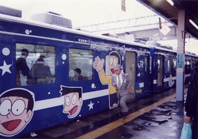 ドラえもん車両をバックに走る