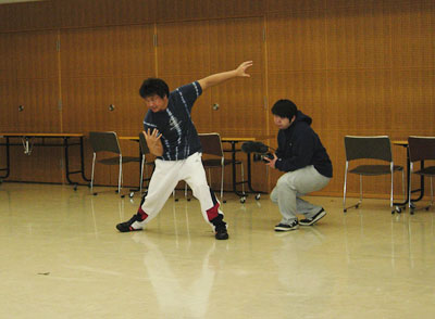 「稽古に打ち込む演者を肉迫撮影するカメラマン」
