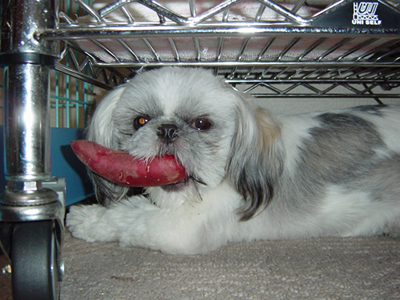 | …たしかにワイルドですね。 メールによりますと、 投稿者さまの愛犬パフィーちゃんが、 台所のイモを盗んで電話台の下で 囓っていたところを撮った一枚のようです。 |