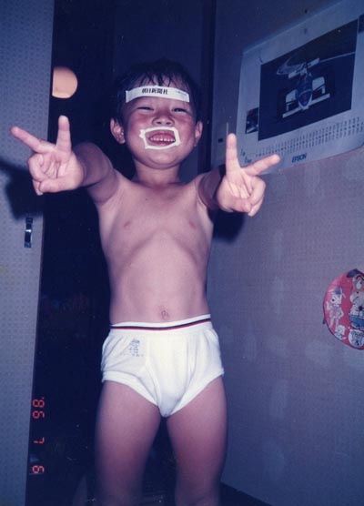 | シールだ!→うれしい!→顔に貼ろう!→ 服も脱ごう!→ダブルピース!という一連の流れ。 なんというフリーダムな精神じゃ。 |