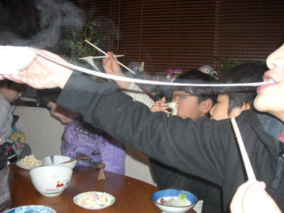 | みんなが箸を使って伸ばす中、 器を遠ざけることで伸ばすという手法を編み出した。 子供にとっては最も自慢したくなる類の発見じゃ。 |