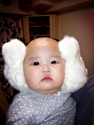 | イヤーマフラーをつけた 八ヶ月の赤ちゃんだそうです。 ホントお茶の水博士みたいですね。 |