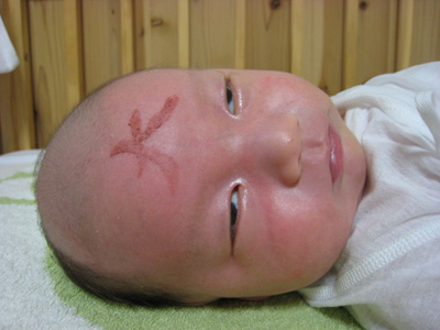 | 怪談の一場面ではなく、お宮参りの写真です。 京都の習慣で男の子の額には「大」 女の子には「小」と書くのだそうです。 |