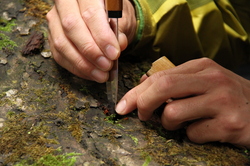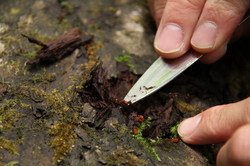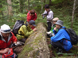 「この倒木に 冬虫夏草がいるんですよ」 新井さんの案内で、 みんながひとつの倒木を囲みます。 冬虫夏草。 図鑑などで見ただけですが、 寄生するヤツですよね? セミの幼虫のからだから、 ニョキニョキときのこがはえている イラストを鮮烈に覚えています。 あれが、この倒木のなかに? 稜さんがナイフで樹皮を探っています。