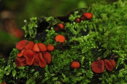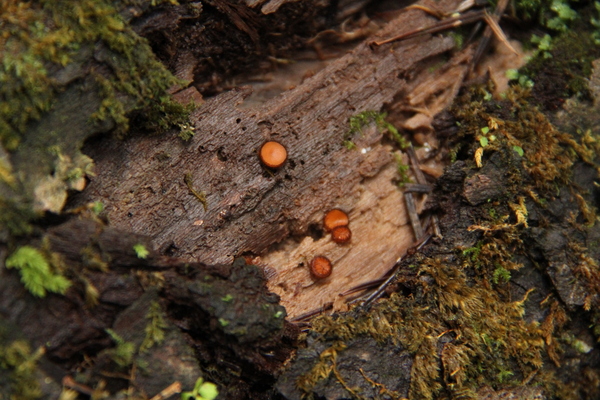 アラゲコベニチャワンタケは、 「お皿」の直径が5mm前後の微小きのこ。 とても小さいけど、真っ赤で目立つので、 倒木などを探すと 簡単に見つけることができます。
