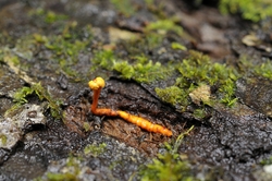きのこは、枯木や倒木をはじめ、 生木や、他のきのこなどからも 発生しますが、 このサビイロクビオレタケは、 朽木に生息している 甲虫の幼虫に寄生する、 いわゆる「冬虫夏草」です。