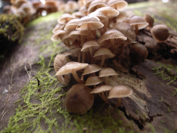 ちいさいのが集まって、はえてます。 かわいいなぁ。 「センボンクヌギタケ」 っていう名前だそうです。 |