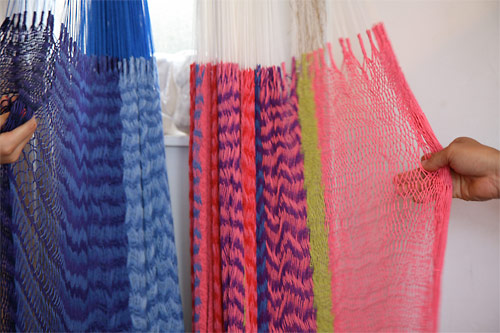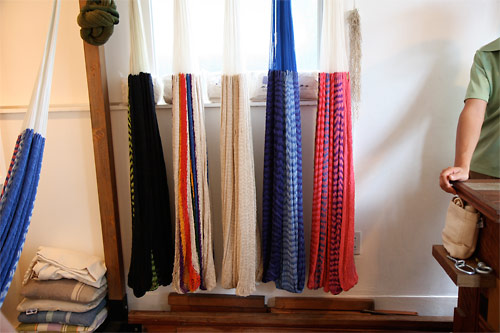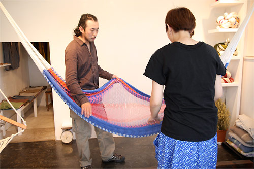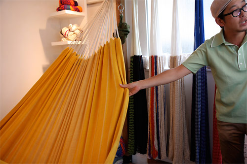 手織りだと織りがかたくなりすぎないから、 ハンモックにちょうどいい 肌ざわりの布になるんですね。 |