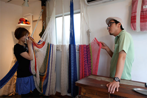 「Hammock2000」の本店は、 山梨の八ヶ岳のふもとのほうにあります。 もともと関東近郊のお客さんが多いので、 都内で気軽にハンモックの乗り心地を 実感できる場所としてこちらを開かれたそうです。 |