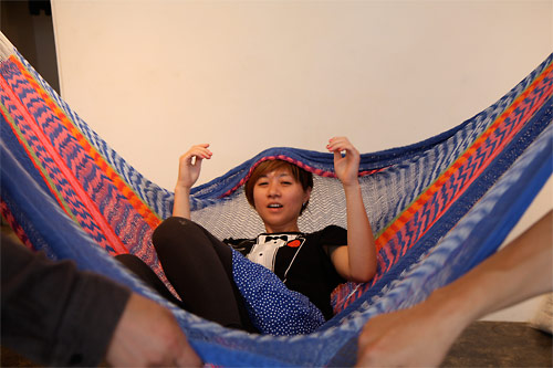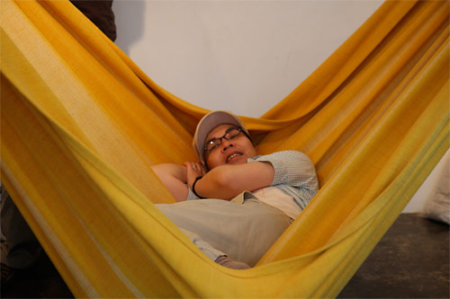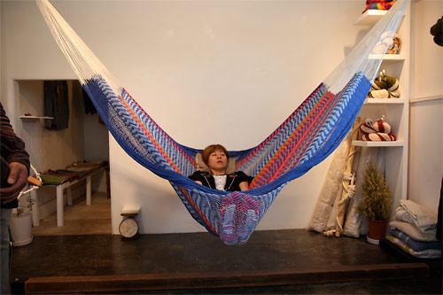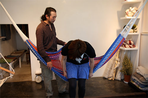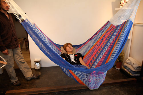 パレットビルのギャラリーでわれわれは、 チェアー型のハンモックに出会いました。 |