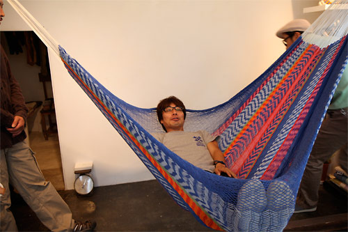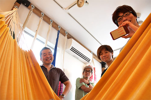 その足で行きました。 ハンモックに強い興味をもつ、 総勢4名で世田谷のショールームへお邪魔しました。 |