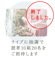 | 当日のようすは、 Ustream&ニコ生で生中継をいたします。 が、少ない人数だったとしても 実際のお客さまの目の前で歌いたいという 安藤さんのご希望により、 10組20名の読者をご招待することにしました。 参加ご希望のかたは 以下の応募フォームに必要事項をご記入ください。 締切は10月25日(金)午前11時です。 当選された方にのみ 当日の諸注意事項などを記した当選メールを 10月25日(金)中にお送りいたします。 ※ 応募の受付は終了しました。 |