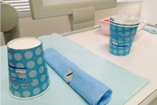 ▲このコップは「時間内にどれだけ唾液が出るでしょう」という検査用。けっこうヨダレマンでした。