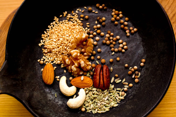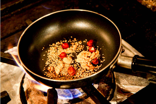 ▲材料ずらり。基本はクルミ、コリアンダーシード、白ごまの3つです。ナッツ類については、