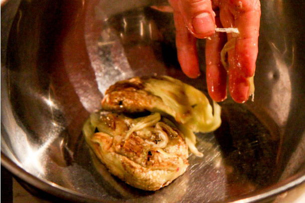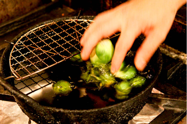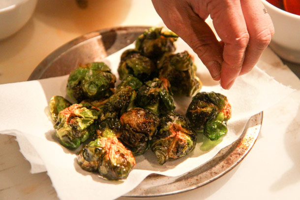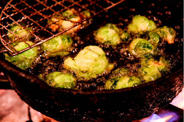 芽キャベツ! おいしいしビタミンもミネラルもあるけど、 「そうなんです。 へえ、苦味が、香ばしさに! 「苦味が消えるわけじゃないんだと思います。 しょうじき「揚げるんかい!」って思いましたよ。 あぢ、あぢぢぢぢ! でも、おいしー! |