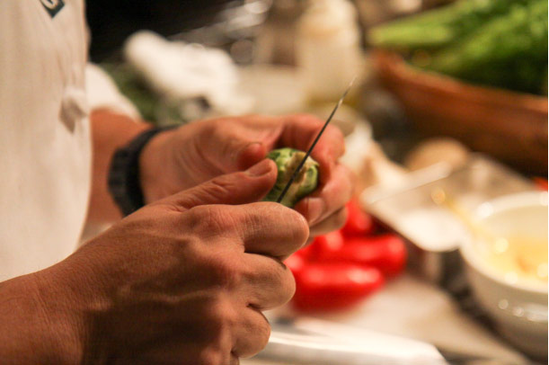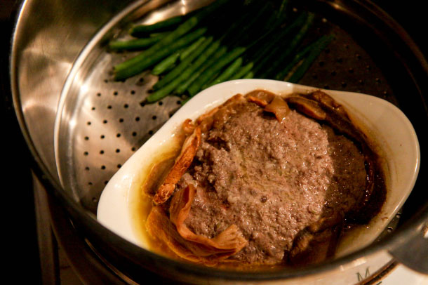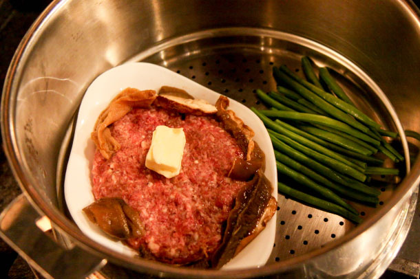 ▲ポルチーニとバターをのせて、いんげんといっしょに蒸し器へ。(工程4)
