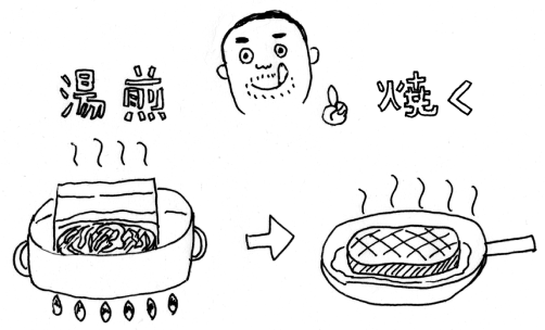 「言いますねえ。でもぼくはしないかな。 うん、それはなぜ? 「『やってみてとくにいいわけでもなかった』 そうそう、お肉も焼く前に、冷蔵庫から出しておいて、 |
