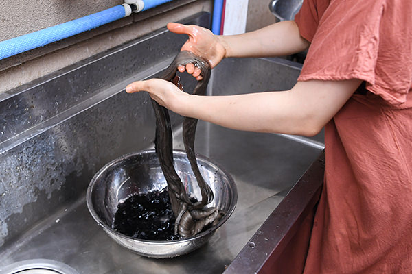 ▲玉ねぎを鉄媒染しているところ。明礬(みょうばん)や石灰で媒染するよりもぐっと深みが増し、カーキのような色に染まります。