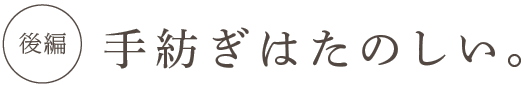 | 福井 | こうやって試しに手で紡いでいるとね、 ああ、こちらの糸はぜんぶ こうして作られたんですねって、 みんな、言ってくれはるみたいやけどね、 ぜんぶがぜんぶそんなわけないよなぁ(笑)。 やってたら、もう、とてもやないけど体がもたん。 ただ、楽しいですよ、手作業は。 わりと単純作業なんですけども、 ぎっこぎっこぎっこ、リズムを刻んでると、 何か落ち着くんですよ。 |