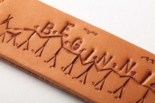 焼きごてで描かれた「BEGINNING」のマーク。