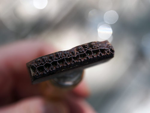 固まる前に、焼き鏝(ごて)で刻印を捺して、