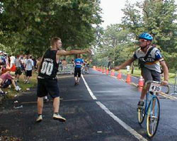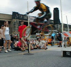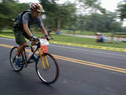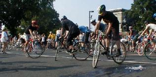 | Cycle Messenger World Championshipsに来ています 後編 日本に帰国してようやく落ち着きました。 自転車思想の第4回は、 CMWC(メッセンジャー世界大会)の後編です。 年に一度、700人以上のメッセンジャーたちが、 世界のどこかに集まって何をやっているのか? チャンピオンシップというくらいなので、 レースをやっているというのは想像できますね。 じゃぁ、どういうレースをやるのか? そこからスタートしましょう。 (ちょっと説明長いです。ゴメンナサイ。) CMWCで行われる競技は、基本的に以下の6種です。 ・メインレース ・スプリント ・バニーホップ ・トライアル ・トラックスタンド ・トラックスキッド ざっと説明すると、 メインレースは実際のメッセンジャーの仕事、 つまり荷物をピックアップし、デリバリーする、 というもののシミュレーションです。 細かいルールもたくさんありますが、ここでは割愛。 これは2日間に渡る予選と、 4時間(!)にも及ぶ決勝があります。 スプリントは単純明快、 短距離をだれが一番早いタイムで走るか、です。 バニーホップ、 これは自転車で行うハイジャンプですね。 優勝者は1メートル近く飛びます。 この写真の時点ではバーの位置はまだ低いですが、 競技者はそのはるか上を飛んでいますね。 トライアル、 これはいわゆる曲乗りです。 スクラップ寸前の自動車を使って、 そのクルマに乗り上げたりもします。 (そして、最後にクルマを壊したりもします。) トラックスタンドと、 トラックスキッドは細かい説明が必要ですね。 トラックバイクという自転車の種類があります。 基本的には、自転車競技場でのレース専用です。 日本の自転車乗りの方には、 固定ギアとか、 ピストという名前が馴染み深いかもしれません。 競輪用の自転車ってご存知ですか? あのブレーキの無いやつです。 アマチュアレベルでも、 専用トラックを使った自転車競技が盛んな欧米では、 日本と異なり、一般の自転車屋さんでも、 この手の自転車を販売しているのです。 普通の自転車の場合、 こいでる最中にペダルを回すのを止めても、 そのまま自転車は前に進みますよね。 いつもいつもペダルを回している必要はありません。 これをフリーギアといいます。 これに対し、固定ギアというのは ペダルと車輪の回転が完全に固定されています。 走ってる限り、ペダルを回し続ける必要があるわけです。 たとえば、坂道を下る時、普通の自転車だったら、 ペダルを止めてもドンドン加速していきますが、 固定ギアの場合、下る勢いに合わせて ペダルを回し続けなくてはいけません。 というか、強制的に回される羽目に陥ります。 じゃぁ、どうやって止まるのか? 問題ですねぇ。 前に進みながら、普通にペダルを回転させる方向と 逆方向に徐々に力をかけていけば減速していきます。 一輪車に乗ったことのある人なら理解しやすいでしょう。 そして、一輪車と同様に停止した状態で ペダルを逆に回転させれば、そのままバックもできます。 で、これがトラックスタンドです。 立っています。ただただ立っています。 ある意味非常に平和な光景ですが、これも競技なのです。 普通にやってると延々続いてしまうので、 途中で一斉に手をハンドルから放したりもします。 バランスと筋持久力が勝負ですね。 最後にトラックスキッド。 固定ギアの自転車に乗って、重心をグッと前輪に移動します。 ペダルと固定されている後輪にかかる荷重は、 当然減少していきます。 そこで足を踏ん張ってペダルの回転を止めると、 路面との摩擦が低い競技用の細いタイヤは、 路面をグリップしなくなり、スリップし始めます。 で、どこまでスリップしながら長距離進めるかが、 この競技の目的なのです。 カーリングの石をどこまで遠くに滑らせることが出来るか、 ということを自転車でやっているわけです。 (ふぅ、説明について来てくれてありがとうございます。) どこまで滑るかというと、 上手い人であれば軽く200mくらいは、滑っていきます。 これもいかにバランスを維持できるかが勝負です。 というように一般の自転車競技と全く違う競技が、 メッセンジャー世界大会では行われています。 今年はメインレースの決勝に、 日本のメッセンジャーが5人出場しました。 東京2人、横浜、京都、鹿児島から1人ずつでした。 (東京以外にもいますよ、メッセンジャーは。) 彼は鹿児島のメッセンジャー辻君。 何度もCMWCに参加している彼は、 昨年たった1人で、鹿児島にメッセンジャーの会社を スタートさせました。 鹿児島名物のドカ灰と、CMWCの時は休業するという、 何とも素敵な仕事っぷりです。 彼をはじめ、今回は東京以外の街で仕事をしている メッセンジャーたちのパワフルさが光りましたね。 僕自身は見事予選落ちでしたから、 決勝では応援&補給に回ってました。 その補給所での面白かったシーンです。 補給所で、何故かビールを手渡しています。 そして、それを受け取ろうとする選手。 こういう