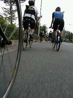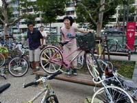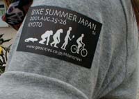 | 第46回 夏は終わった 〜京都バイクサマーのこと。 こんにちは。 僕の夏が終わりました。 なんて書くと寂しい感じですが、 ではなくって、スッゴクシミジミといい感じなんです。 もちろん、それは京都で行われたバイクサマーのこと。 今からレポートしまっせ〜。 時間とお金、どっちも乏しいけど、 どっちかといえば、お金の方が乏しい僕は、 品川発〜大垣行きの夜行快速電車で、京都に向かいました。 当然、自転車たたんで電車に持込みです。 最初は2人で行く予定でしたが、 夜になってから、新たに2人が同行を表明してきました。 「悩んでたんだけど、最初の時に行っとかないと、 後で若い奴らに自慢できないからなぁ。」 くぅ〜、嬉しいこと言ってくれるじゃないですか! そう、今回の京都バイクサマー、 もちろん、バイクサマーというイベントも初めてだし、 日本中のいろんな都市で、 クリティカルマスに参加している、多くの人たちが集まる、 そういう意味でも初めての“何か”なんです。 8/25、土曜日の朝京都着。 しばらく勝手に自由行動、 午後1時過ぎに、京都市役所前に集合です。 最初は30人くらいだったんですが、 次から次に人が集まってきて、 いつの間にやら、 100人近い自転車乗りが集まってきました。 中には、4日前に日本に来たばかりの、 オーストラリア人もいました。 何でも、京都の街を自転車で走っていて、 ナンパ!?されたそうです。 ちなみに、確認できてるだけの内訳は、 京都61名 大阪15名 東京10名 滋賀6名 兵庫5名 和歌山1名 神奈川1名 鹿児島1名 静岡1名 山口1名 スロベニア1名 オーストラリア1名 合計104人でした。 土曜日に参加できなくって、 日曜のイベントにだけ参加した人もいますから、 実際にはもっと多かったはずです。 ひと通り人が集まったところで、 なんとなく挨拶の時間になりました。 ついでに何人かが愛車自慢したりして。 つーか、この写真の中だけで一体何台あるんだ? その後、集まった人たちで、 1文字ずつバイクサマー横断幕を書きました。 僕が書いたのは、"SUMMER"の最初の"M"です。 "R"を書いたのは、手前の子供たち。 やっぱ、Revolutionの"R"なのかなぁ? なんて思ったりして…。 午後4時に、バイクサマー京都クリティカルマススタート。 京都市役所を後にして、御池通りを西に、 メインストリートの烏丸通りを京都駅方面に下ります。 100人を超えるクリティカルマスライドは、 東京で何回か体験してるんですが、 今回は全体がスゴーク長くなってしまい、 交通量の多い大通りでは、正直言って疲れましたね〜。 しばらくして、ライドは鴨川沿いに向かいました。 いったん川沿いのサイクリングロードに入ります。 歩いてる歩行者の人に、 「ごめんなさ〜い」 とか言いながら、進んで行きます。 そりゃ、歩いてる人も驚きますよねぇ、自転車104台。 ここで問題発生、 サイクリングロードから一般道に戻るスロープに、 たくさんの自転車が駐輪されてました。 人が1人通れるくらいのスペースしかありません。 普通の自転車ならいいけど、横幅のあるリカンベントや、 子供を乗せたトレーラーを引いている自転車は通れません。 突如、停めてある自転車の整理が始まりました。 僕もやりましたけど、みなさんご苦労様! いったん、京都市役所前まで戻って、一休み。 この後は、今回初の試みなんですが、 “1ブロックだけ未来先取り” とも言えちゃうようなことをやりました。 碁盤の目状になっている京都の路地、 その1ブロックに自転車乗りが集まり、 10分間だけ自由に走ろう、という企画です。 「お、こんにちは」 「今日はなんだか自転車が多いねぇ」 「ホント、どうしたんやろう?」 なんて白々しい会話をしながら、 路地をグルグル回っていると、 次から次に知った顔に出会います。 しばらく走った後、 僕は道沿いのカフェに1人で入って、 コーヒーを飲みつつ、 ちょっと気になる、稲垣悟郎氏逮捕の記事を読んだりして、 お店の中からその光景を見ていました。 これも何とも言えず面白かったなぁ。 ホントに切れ目無く自転車が通ってるんですもん。 この瞬間、京都の、この路地だけは、 僕が見たいと願う未来を先取りしていました。 続きます。 Ride safe! |