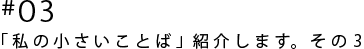 | 私の小さいことばは、 「『日の出の時がくるまで、日は出ない」という 当たり前そうなことをわかるのには、 ずいぶん時間がかかったと思う。 このことも、 『時が来るまで』ということだった。」です。 (32ページより) 仕事も恋愛もなかなか上手くいかなくて やたら焦っていたときに、このことばと出会って ハッとして、そうだ、焦ったってしょうがないんだった! と、もとの楽天的な自分に戻れたので とても感謝しています。 (ゆっち) |