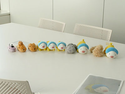 ええ、そのチームは女性だけのチームで、 世の流行を捉えながら 新しいキャラクターとか 売れるものを発掘しようみたいな、 比較的自由度の高いところなんです。 そこで、いろいろ描いているうちに、 これはちょっとかわいいからやってみたいな、 というところから商品化をしてみたら、 じわじわ売れてきて、 いまや大爆発みたいな形になった、 類まれなキャラクターなんです。 きょうはブタフィーヌさんが ウチの会社にいらっしゃるということで 「だれだ、だれだ」的な感じで お出迎えさせていただきました。 |
