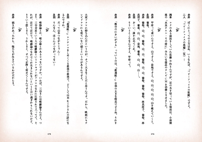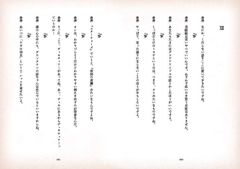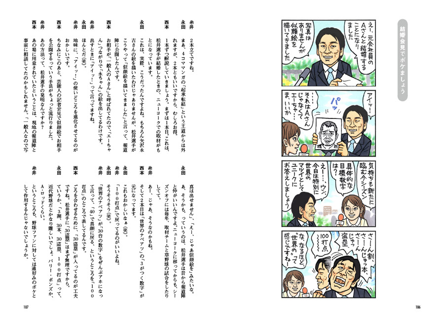 ![]() 「似てるわ(笑)」と吹き出すほど クオリティーの高い似顔絵と、 「くだらないわ(笑)」と呆れるほどのダジャレ、 そしてしばしば読者を 「‥‥なんだって?」と煙に巻く複雑なプロット。 こんなに高密度な情報が、 たった4コマに収められているのですから驚きです。 第1回ほぼ日マンガ大賞受賞作家、荒井清和、 待望の単行本第2弾がついに完成しました! 前作にも増して、見所満載、ボリュームたっぷり! ![]() 連載150話の中から、厳選した100話を選び、 執念深く修正を施して1冊にまとめました。 情報量の多さには定評のあるマンガですが、 それが100話も集まると、圧倒的な読み応え! どうぞ、じっくりお読みください。 ![]() この本のために描きおろされた 4ページの(荒井先生にしては)長編マンガを収録! 時空を超えたセクシーSF超大作、と、 まぁ、いえないことも、ありません。 さらに、4コママンガも1本描きおろし! こりゃぁ、お得! という仕上がりになっています。 ![]() 前代未聞、出版業界に大きな波紋を 投げかけたといえなくもない、 あの雑談解説はもちろん健在! 糸井重里とほか2名(西本・永田)から成る 「ほぼ日テレビガイド男子部」が 100本のマンガすべてを雑談解説しています。 もちろん、この本にのみ収録。 その雑談量、なんと7万7千字! 非常識! ![]() 「だいたいの仕様はわかったけど、 手にとらないとピンとこないなぁ」 というあなたのために、 立ち読みコーナーをつくってみました。 見開き形式でいくつかお読みいただけることはもちろん、 前作でご好評いただきました、 「立ち読み動画」も準備しましたよー。 この「立ち読み動画」ってのがなにかというと、 「全ページをぱらぱらめくる立ち読み動画」です。 ![]()