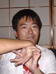 | 第5回 「手首」 毎度! トギーです。 今回は「手首」の話。 先日、東京出張がありまして、鼠穴におじゃました。 その時、アブラミブラザーズの弟こと、 金澤セイヒローさんとお会いしたんですが、 トギーへの第一印象は 思ったより「ごつい」といった感じのようで、 立つ度に「でかいなぁー」と言われ、 珍獣を見るような目でした。 考えてみれば、身長182センチ、体重83キロは、 相撲取りの新弟子検査も楽々パスだし、 レスラーにもなれそうだ。 ブーメラン界でもごつい方の部類で、 「体だけは世界級やなー」と冷やかされたものです。 一方、セイヒローさんとは初めてお会いしましたが、 『ダイエットゲリラ』などで予備知識があり、 体つきや顔の輪郭がほぼ似ていると思っていたら、 やっぱり同系列でした。(失礼) 「体の肉の付き方も、ほんま似とるなぁー」 と考えていると、 トギーもアブラミブラザーズ予備軍であることを予知。 だって、去年の世界大会の時の体重は 75キロでしたから・・・。 せっかくだったので、「6畳用・紙ブーメラン」を 披露したり、投げてもらったりと、 ブーメランを体験していただきました。 その後、ひょんなことから、手首の話に移行したのねん。 人差し指が腕にくっつきます。 人差し指がつく人はなかなかいませんので、試してみて! セイヒローさんは「折れとるんちゃうんか!」といった目で トギーの手首をマジマジ鑑賞。 直後、その場にいた人たち全員で 「手首、曲げ大会」が始まっちゃいました。 ユリ・ゲラーのスプーン曲げをテレビで見て、 家族全員でやってるみたいだった。 しかし至る所で「アタタタタ……」。 セイヒローさんはトギーの手首が気に入られたようで、 手首の記念撮影。 当然、手首をメインに撮ったのは生まれて初めて。 初の写真撮影に、かぼそい手首もやや緊張気味でした。 でも、手首の軟らかいことがブーメランにとって 有利かどうかはわからないのだ。 プロ野球の投手もやっぱり軟らかいのでしょうかね? いやはや、自分でもこの手首、 なんで軟らかいのか不思議だ。 これからは逆にも曲がるようにチャレンジして、 さらに「軟体手首化」を実行します。 はたして何かの役に立つのだろうか・・・。 ということで、「手首」の話でした。 |