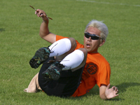 第76回 フランス世界大会への道<その5> 4位と思いも寄らぬ高発進となった日本チーム。 各国の厳しいマークを受けながらも、 表彰台に向けて2日目がスタート。 2日目は日本チームがもっとも不得意とする、 オージーラウンドという種目。 とにかく長距離(50m)勝負なのだ。 毎回この種目で順位を落として失速するので、 今年こそは!と気合いを入れて挑みました。 が、やっぱりダメでした・・・。 みんなドロップしたりして点数が稼げず、 結局17チーム中12位。 今回もここで一気に失速しちゃったのだ。 日本チームの化けの皮がはがれたって感じです。 どういうわけか、この種目はホント苦手なんですよね。 もちろんトギーも、ダメでした。 その後、どうもパッとしなくなった日本チームは、 各国からのマークもなくなり、少し寂しい状態に。 でも、がんばりましたよ。 2日目の最終はチームリレーという種目。 30m走り、ブーメランを投げて、 キャッチしたら走って戻ってきて、 次の人にタッチ。 4人で2巡します。 なんとこの種目は、その日の最高タイムを出し、 世界大会の種目別では、初めて日本が1位をゲット! 記念すべき種目となりました。 ちなみにトギーは、走る種目だったので不参加。 1位の味をかみしめることはできませんでした。 結局2日目が終わって順位は5位に後退。 そして、最終日の3日目。 ドイツのBチームに追い上げられながらも、 何とか踏ん張り、残りも2種目になった。 トリックキャッチ/ダブリング。 トギーの最後の出番なのだ。 投げて戻ってきたブーメランを、 規定の方法でキャッチします。 片手でキャッチしたり、 背中に手を回してキャッチしたり、 蹴り上げてキャッチしたり、 寝ころんで足でキャッチしたり。 さらに、同時に2本のブーメランを投げて、 両方ともキャッチする規定もあるのだ。 この種目アクロバティックなので、 見ていて面白いですよ。 プレイする方は大変なんですけどね。 競技直前、トギー達が練習に入ったところで、 思わぬアクシデント発生。 一天にわかにかき曇り、 風も出てきて、遠くの空では雷鳴が・・・。 それでも気にせず練習をしていたら、 みんなが「逃げろー!」って感じでテントへダッシュ! 一瞬にして100人近くの選手たちが大移動。 直後にサンダーストーム。 激しい風雨に、テントの中にいても怖いぐらいでした。 30分ほどで、今度は信じられないような晴天。 試合は何事もなかったかのように再開されたのだ。 ついさっきまでの強風が嘘のように無風になり、 嵐を呼ぶ男(?)トギーも絶好調! バンバンキャッチし、高得点をマークしました。 ![]() 足でキャッチしてます なんとこの種目、団体戦の種目総合で2位。 嬉しかったのだ。 ってなことで、3日間の団体戦が終了。 結局日本チームは5位でフィニッシュ。 それでも、過去最高順位! 優勝はドイツチーム。 なんと、7種目中6種目を制し、 手が付けられない強さ。 準優勝は地元フランスチーム。 ホームで大活躍でした。 3位はスイスチーム。 最初は日本と競ってたんだけどなぁ〜。 さて、フランス大会の話もあと2回です。 トギー(栂井靖弘) KBN(関西ブーメランネットワーク) http://www.kbn3.com |