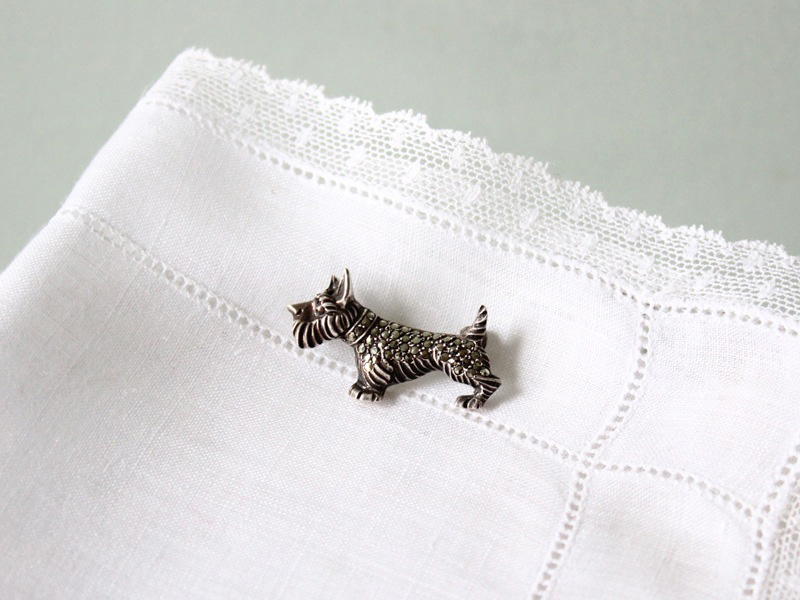 体と首輪部分にちりばめられているのは、 ヴィクトリア時代からジュエリーに用いられるようになった マーカサイト(マルカジット)という鉄鉱の一種。 マーカサイトはダイヤモンドの代用品とされていただけあって 自然光のもとでの輝きが魅力。