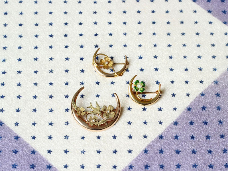1890年代から1910年代ごろまで流行した、 平均して直径2〜3cmの小さな三日月のブローチ。 これらは夫が結婚したばかりの伴侶へ贈る特別なジュエリーで 「ハネムーン・ピン」と呼ばれた。 「ハネムーン」という言葉は、 現代では新婚旅行という意味で使われるが、 本来は結婚後最初の1ヶ月間のこと。 ハネムーンを示す三日月(ムーン)に、 愛情の深さや幸運を意味するモチーフ (つばめ、忘れな草、すみれ、クローバーなど)を 組み合わせたデザインが当時は一般的だったようだ。 多くは金製で、 ダイヤモンド、ルビー、シードパールなどで華を添えたものもある。