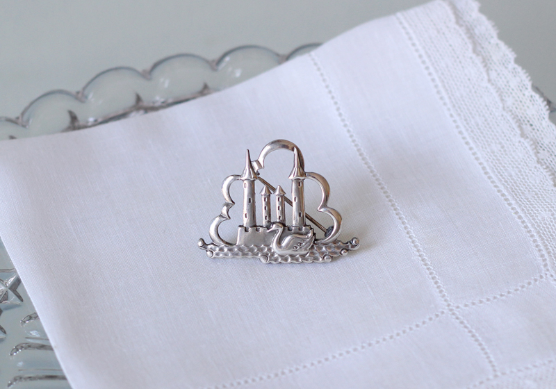 古城を背に白鳥がスイスイと泳ぐ、銀製のヴィンテージブローチ。